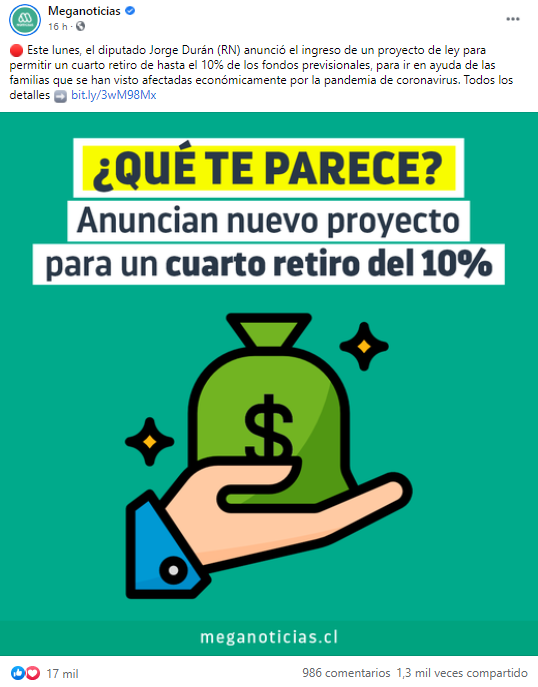 - Gran impacto sobre la noticia de que el diputado Jorge Durán (RN) anunció el ingreso de un proyecto de ley para permitir un cuarto retiro de hasta el 10% de los fondos previsionales, para ayudar a las familias que se han visto afectadas económicamente por la pandemia.
