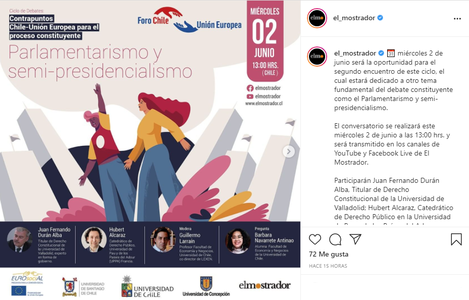 - Hoy se realizará el segundo encuentro del ciclo Foro Chile y Unión Europea, el cual estará dedicado al debate constituyente sobre Parlamentarismo y semi-presidencialismo. El evento será moderado por Guillermo Larraín, profesor de la Facultad de Economía y Negocios la Universidad de Chile.