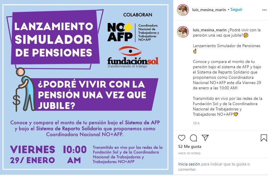 - La Fundación Sol y el candidato constituyente Luis Mesina están contribuyendo a difundir la propuesta de un nuevo sistema de pensiones de la plataforma No+AFP.