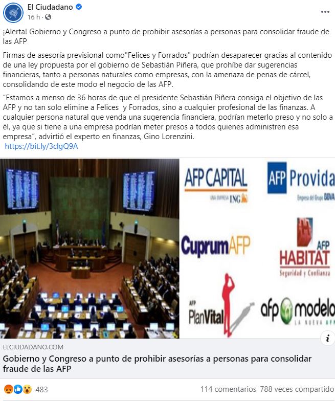 - Se detectan varios usuarios, mayoritariamente seguidores de Felices y Forrados, que rechazan el proyecto que regulará a los asesores financieros. Utilizan el hashtag #RechazaArticulo4 o #RechazaLeyMordazaDePiñera.