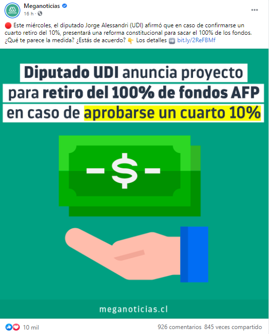 • El diputado Jorge Alessandri (UDI) afirmó que en caso de confirmarse un cuarto retiro del 10%, presentará una reforma constitucional para sacar el 100% de los fondos. Esto generó polémica entre usuarios con ideas encontradas.