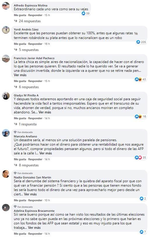 • Hay quienes consideran que esta propuesta es demagógica y una “cortina de humo”, a la vez que perjudicará la vejez de quienes hoy pudieran quedarse sin fondos. Del otro lado se observan usuarios a favor de la medida, que consideran que disponer de ese capital los liberaría y haría más autónomos de su dinero, a la vez que evitaría que se los “expropien”.