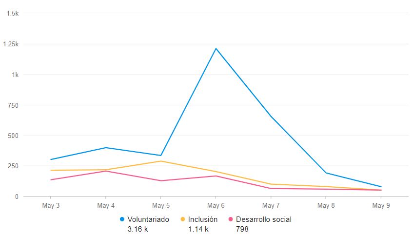 Menciones en redes sociales, medios y blogs en español sobre marcas y empresas vinculadas a voluntariados, desarrollo social, campañas solidarias, inclusión, y términos afines.