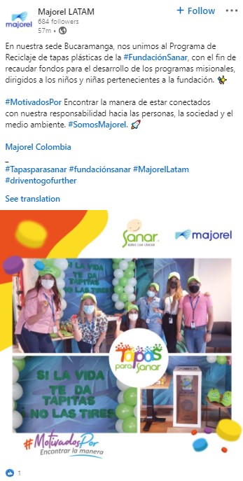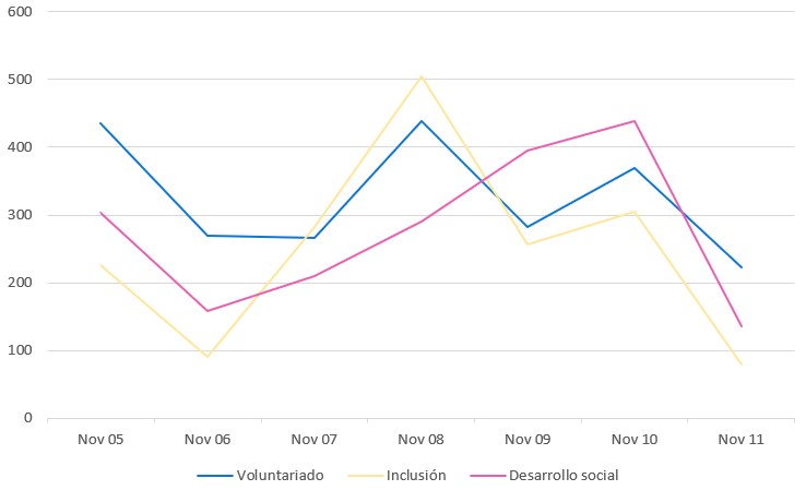 Menciones en redes sociales, medios y blogs en español sobre marcas y empresas vinculadas a voluntariados, desarrollo social, campañas solidarias, inclusión, y términos afines.
