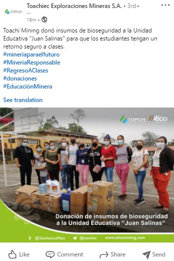 - Toachi Mining donó insumos de bioseguridad a la Unidad Educativa Juan Salinas.