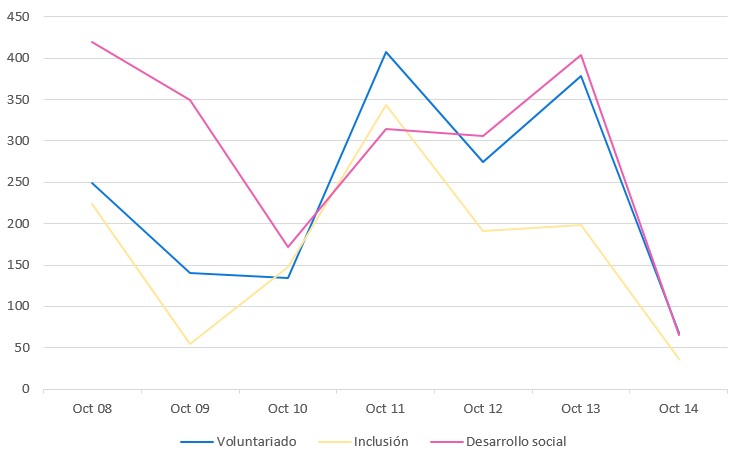 Menciones en redes sociales, medios y blogs en español sobre marcas y empresas vinculadas a voluntariados, desarrollo social, campañas solidarias, inclusión, y términos afines.