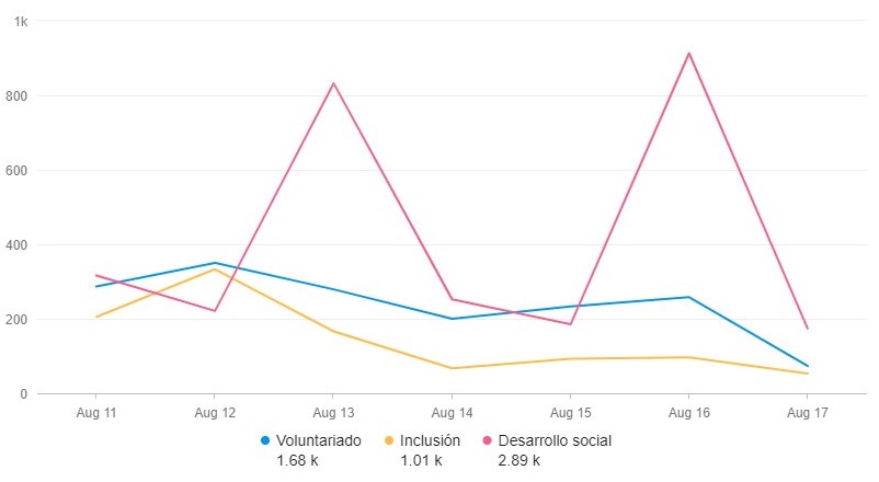 Menciones en redes sociales, medios y blogs en español sobre marcas y empresas vinculadas a voluntariados, desarrollo social, campañas solidarias, inclusión, y términos afines.