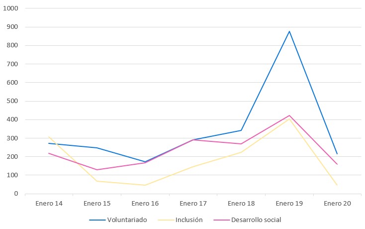 Menciones en redes sociales, medios y blogs en español sobre marcas y empresas vinculadas a voluntariados, desarrollo social, campañas solidarias, inclusión, y términos afines.