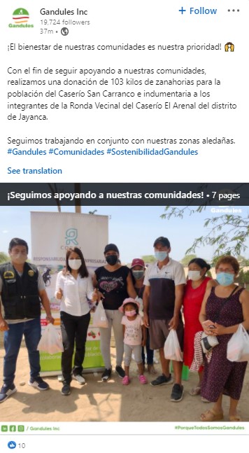 • Gandules Inc Perú realiza donación de alimentos e indumentarias a familias en situación de vulnerabilidad.