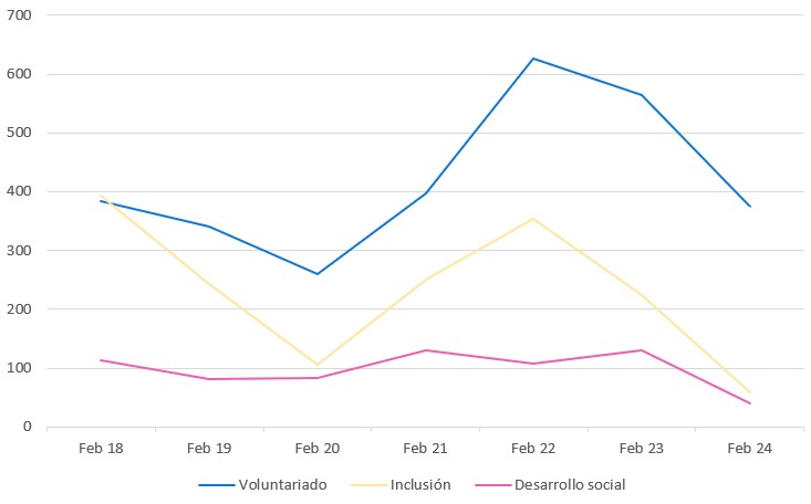 Menciones en redes sociales, medios y blogs en español sobre marcas y empresas vinculadas a voluntariados, desarrollo social, campañas solidarias, inclusión, y términos afines.