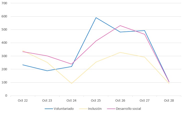 Menciones en redes sociales, medios y blogs en español sobre marcas y empresas vinculadas a voluntariados, desarrollo social, campañas solidarias, inclusión, y términos afines.