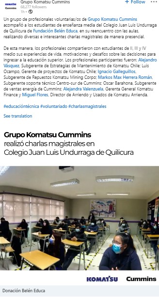 - Grupo Komatsu Cummins Chile con su grupo de voluntariado acompaña a niños en el regreso a la escuela de manera presecial.