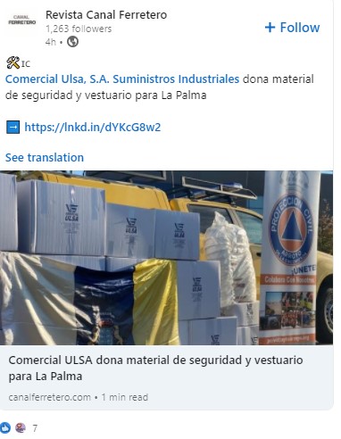 - Comercial Ulsa España dona material de seguridad y vestuario para trabajos de reconstrucción tras el volcán de La Palma.