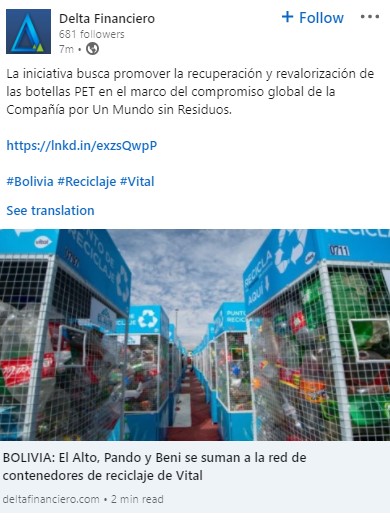 - El alto, Pando y Bendi Bolivia se unen a la iniciativa de incorporar contenedores para reciclar botellas PET.