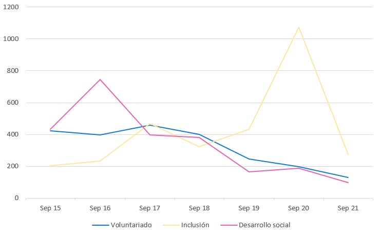 Menciones en redes sociales, medios y blogs en español sobre marcas y empresas vinculadas a voluntariados, desarrollo social, campañas solidarias, inclusión, y términos afines.