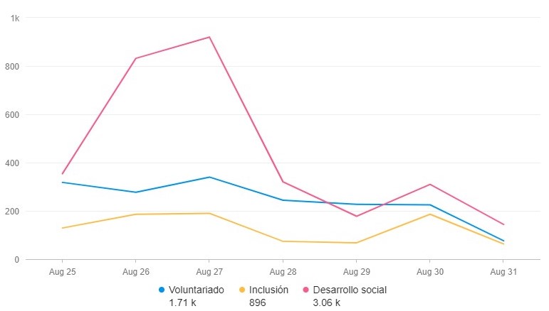 Menciones en redes sociales, medios y blogs en español sobre marcas y empresas vinculadas a voluntariados, desarrollo social, campañas solidarias, inclusión, y términos afines.