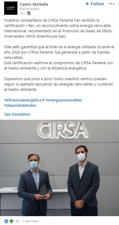 - Cirsa Panamá recibe la certificación I-Rec que garantiza que el total de la energía utilizada durante el año 2020 fue generada a partir de fuentes renovables.