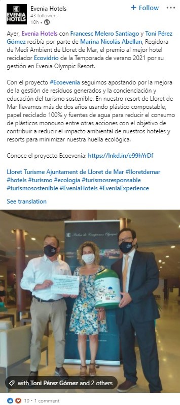 - Evenia España recibe premio al mejor hotel reciclador Ecovidrio de la temporada 2021.