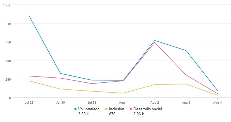 Menciones en redes sociales, medios y blogs en español sobre marcas y empresas vinculadas a voluntariados, desarrollo social, campañas solidarias, inclusión, y términos afines.