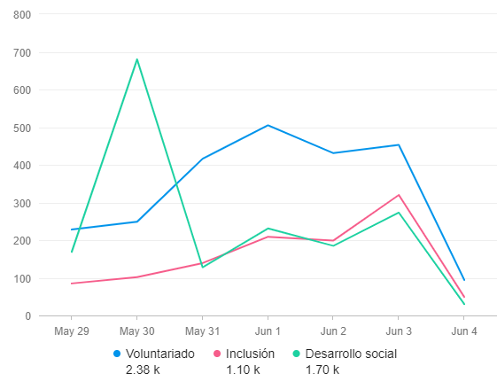 Menciones en redes sociales, medios y blogs en español sobre marcas y empresas vinculadas a voluntariados, desarrollo social, campañas solidarias, inclusión, y términos afines.