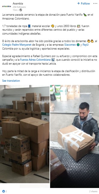 - Avambia dona vestimenta, material escolar y libros a comunidades del Amazonas Colombiano.