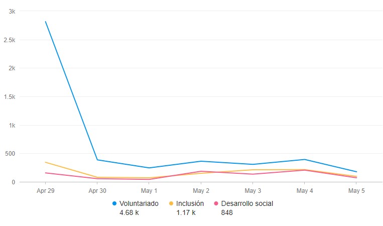 Menciones en redes sociales, medios y blogs en español sobre marcas y empresas vinculadas a voluntariados, desarrollo social, campañas solidarias, inclusión, y términos afines.