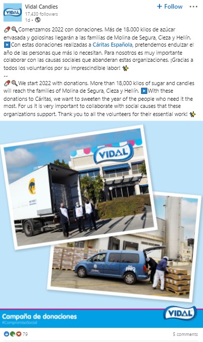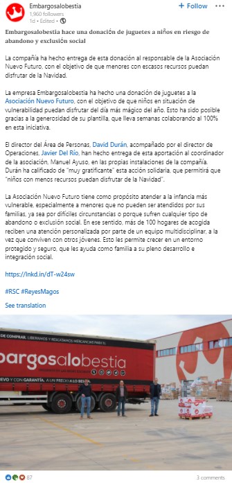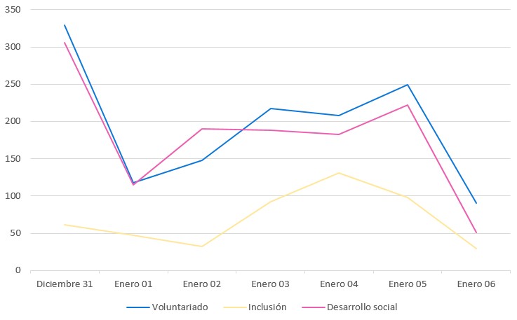 Menciones en redes sociales, medios y blogs en español sobre marcas y empresas vinculadas a voluntariados, desarrollo social, campañas solidarias, inclusión, y términos afines.