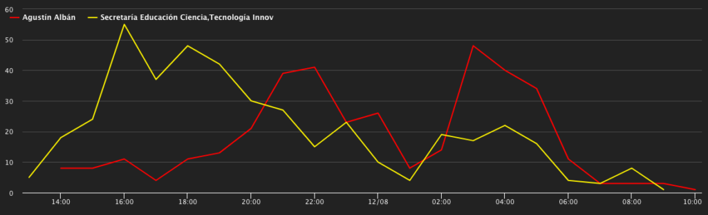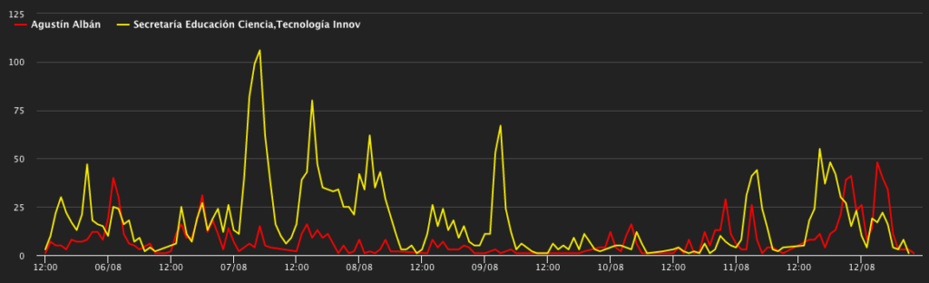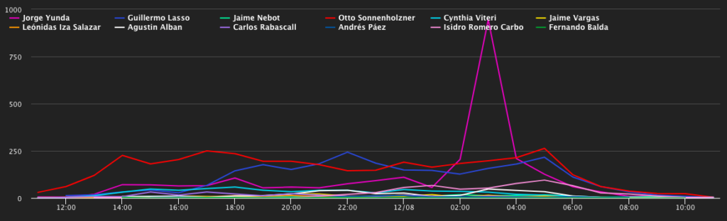 • El primer pico se debe a un tweet crítico. Diana Medina responsabiliza a Lenin, Albán y Richard Martínez de los perjuicios a los becarios. El tweet tiene más de 300 interacciones.