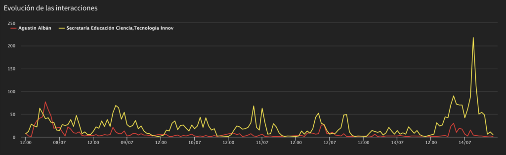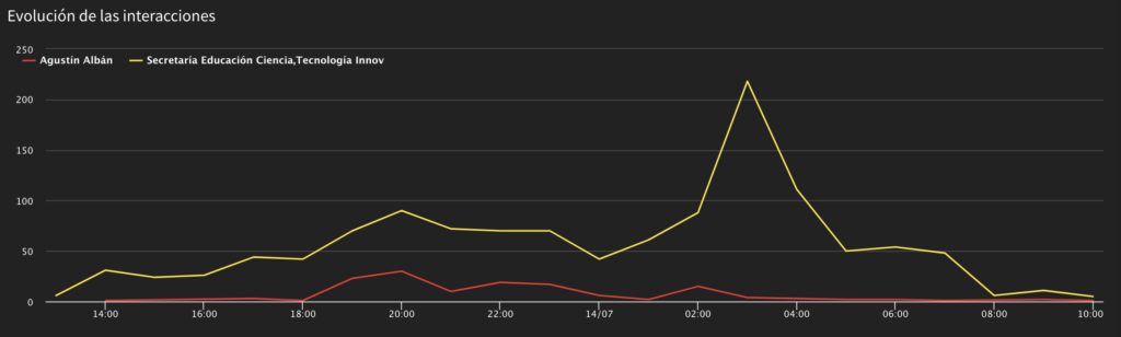 • Mención a Albán en el tweet de Senescyt sobre la transmisión del conversatorio “Proceso de admisión a la educación superior y conectividad para estudiantes” contribuye para el aumento en el volumen de menciones.