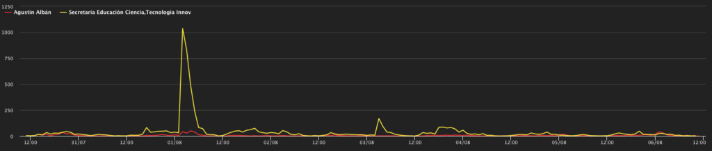 • El pico viene dado de la mención en un tweet de queja por el asunto de los becarios, realizado por Diana Medina.