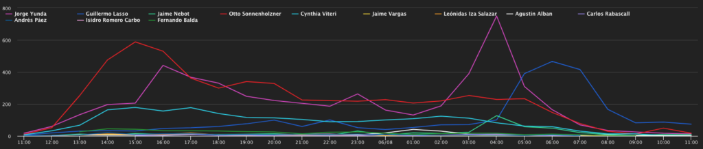 • Volumen de menciones habitual con picos para Jorge Yunda, Otto Sonnenholzner y Guillermo Lasso.
